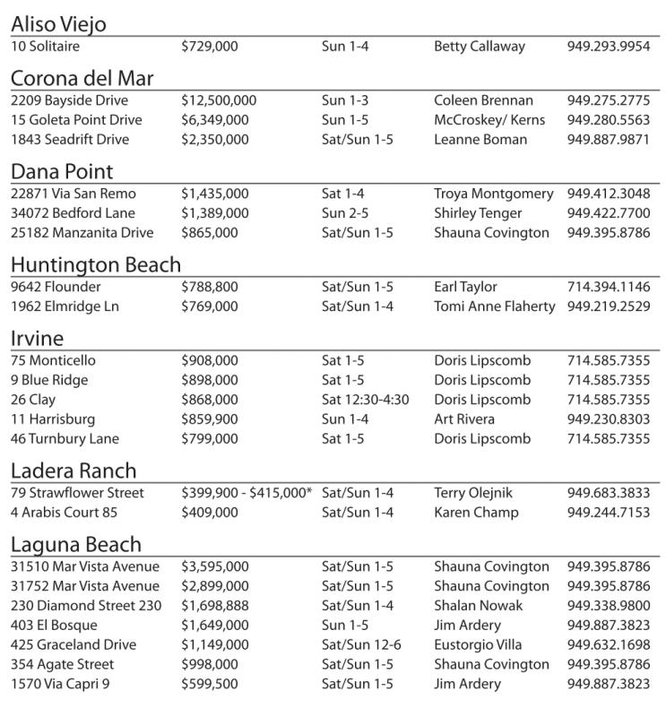 Aliso Viejo 10 Solitaire $729,000 Sun 1-4 BettyCallaway 949.293.9954 Corona del Mar 2209 Bayside Drive $12,500,000 Sun 1-3 Coleen Brennan 949.275.2775 15 Goleta Point Drive $6,349,000 Sun 1-5 McCroskey/ Kerns 949.280.5563 1843 SeadriftDrive $2,350,000 Sat/Sun 1-5 Leanne Boman 949.887.9871 Dana Point 22871Via San Remo $1,435,000 Sat 1-4 TroyaMontgomery 949.412.3048 34072 BedfordLane $1,389,000 Sun 2-5 Shirley Tenger 949.422.7700 25182 Manzanita Drive $865,000 Sat/Sun 1-5 Shauna Covington 949.395.8786 Huntington Beach 9642 Flounder $788,800 Sat/Sun 1-5 Earl Taylor 714.394.1146 1962 Elmridge Ln $769,000 Sat/Sun 1-4 Tomi Anne Flaherty 949.219.2529 Irvine 75 Monticello $908,000 Sat 1-5 Doris Lipscomb 714.585.7355 9Blue Ridge $898,000 Sat 1-5 Doris Lipscomb 714.585.7355 26 Clay $868,000 Sat 12:30-4:30 Doris Lipscomb 714.585.7355 11 Harrisburg $859,900 Sun 1-4 ArtRivera 949.230.8303 46 TurnburyLane $799,000 Sat 1-5 Doris Lipscomb 714.585.7355 Ladera Ranch 79 StrawflowerStreet $399,900 -$415,000* Sat/Sun 1-4 TerryOlejnik 949.683.3833 4Arabis Court85 $409,000 Sat/Sun 1-4 KarenChamp 949.244.7153 Laguna Beach 31510 MarVista Avenue $3,595,000 Sat/Sun 1-5 Shauna Covington 949.395.8786 31752 MarVista Avenue $2,899,000 Sat/Sun 1-5 Shauna Covington 949.395.8786 230 Diamond Street 230 $1,698,888 Sat/Sun 1-4 Shalan Nowak 949.338.9800 403 El Bosque $1,649,000 Sun 1-5 Jim Ardery 949.887.3823 425 Graceland Drive $1,149,000 Sat/Sun 12-6 EustorgioVilla 949.632.1698 354 AgateStreet $998,000 Sat/Sun 1-5 Shauna Covington 949.395.8786 1570 ViaCapri 9 $599,500 Sat/Sun 1-5 Jim Ardery 949.887.3823
