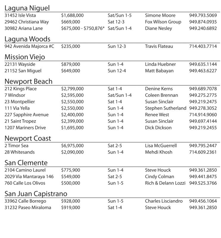 Laguna Niguel 31452 Isle Vista $1,688,000 Sat/Sun 1-5 Simone Moore 949.793.5069 29462 Christiana Way $669,000 Sat 12-3 FoxWilson Group 949.874.0935 30982 Ariana Lane $675,000 -$750,876* Sat/Sun 1-4 Diane Nesley 949.240.6892 Laguna Woods 942 Avenida Majorca #C $235,000 Sun 12-3 Travis Flateau 714.403.7714 Mission Viejo 22131 Wayside $879,000 Sun 1-4 Linda Huebner 949.635.1144 21152 San Miguel $649,000 Sun 12-4 Matt Babayan 949.463.6227 Newport Beach 212 Kings Place $2,799,000 Sat 1-4 Denine Kerns 949.689.7078 7Windsor $2,595,000 Sat/Sun 1-4 Coleen Brennan 949.275.2775 23 Montpellier $2,550,000 Sat 1-4 Susan Sinclair 949.219.2475 111 ViaYella $2,550,000 Sun 1-4 Stephen Sutherland 949.278.3052 227 SapphireAvenue $2,400,000 Sun 1-4 Renee West 714.914.9060 21 Saint Tropez $2,399,000 Sun 1-4 Susan Sinclair 949.697.4144 1207 Mariners Drive $1,695,000 Sun 1-4 Dick Dickson 949.219.2455 Newport Coast 2Timor Sea $6,975,000 Sat 2-5 Lisa McGuerrell 949.795.2447 28 Whitesands $2,090,000 Sun 1-4 Mehdi Khosh 714.609.2361 San Clemente 2104 Camino Laurel $775,900 Sun 1-4 SteveHouck 949.361.2850 2029 ViaMantaraya 146 $549,000 Sat 2-5 Cindy Colman 949.441.8475 760 Calle LosOlivos $500,000 Sun 1-5 Rich &Delann Lozzi 949.525.3766 San Juan Capistrano 33962 Calle Borrego $928,000 Sun 1-5 Charles Lisciandro 949.456.1064 31232 Paseo Miraloma $919,000 Sat 1-4 SteveHouck 949.361.2850