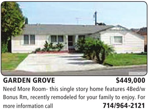 GARDEN GROVE $449,000 Need More Room- this single story home features 4Bed/w Bonus Rm, recently remodeled for your family to enjoy. For more informationcall 714/964-2121