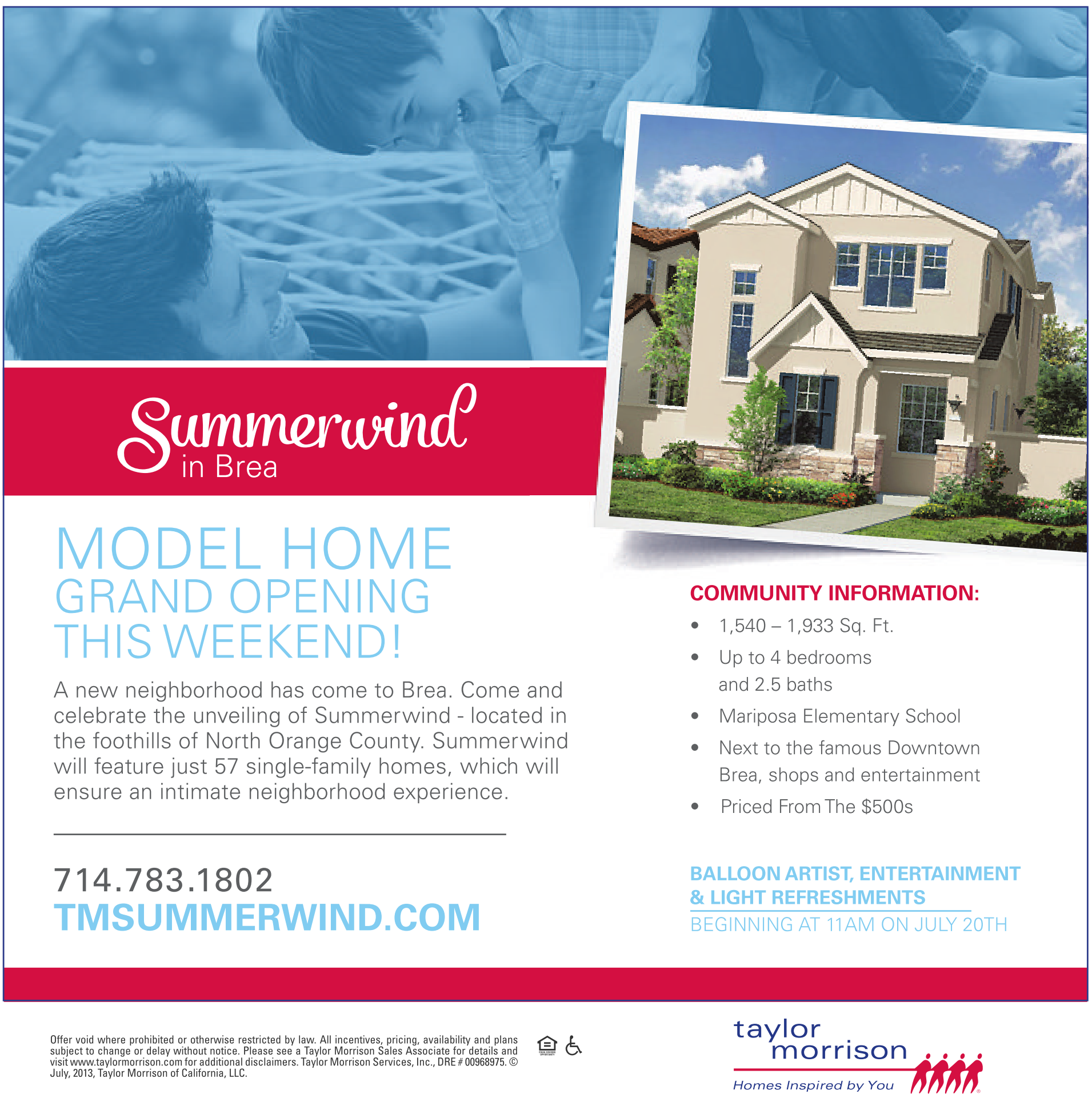Offer void where prohibited or otherwise restricted by law. All incentives, pricing, availability and plans subject to change or delay without notice. Please see aTaylor Morrison Sales Associate for details and visit www.taylormorrison.com for additional disclaimers. Taylor Morrison Services, Inc., DRE #00968975. © July,2013, Taylor Morrison of California, LLC.