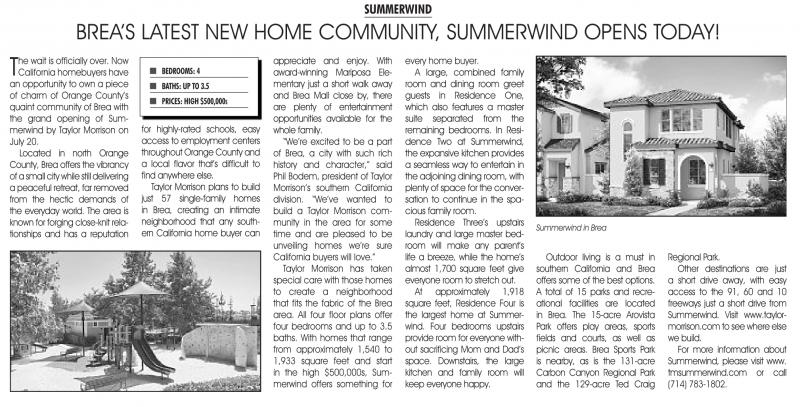 wait is officially over. Now California homebuyers have an opportunity to own a piece of charm of Orange County’s quaint community of Brea with the grand opening of summerwind by taylor Morrison on July 20.