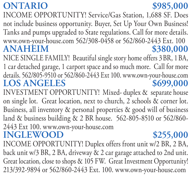 details. 562/805-9510 or 562/860-2443 Ext100.www.own-your-house.com