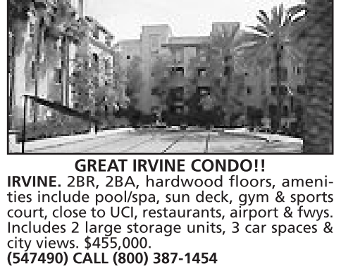 GREAT IRVINE CONDO!! IRVINE. 2BR, 2BA, hardwood floors, amenities include pool/spa, sun deck, gym & sports court, close to UCI, restaurants, airport &fwys. Includes 2 large storage units, 3 car spaces & city views. $455,000. (547490) CALL (800) 387-1454