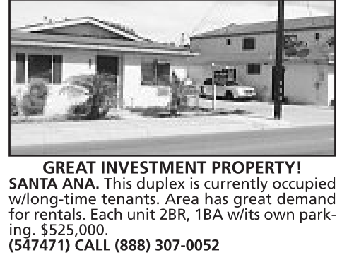 SANTA ANA. This duplex is currently occupied w/long-time tenants. Area has great demand for rentals. Each unit 2BR, 1BA w/its own parking. $525,000.
