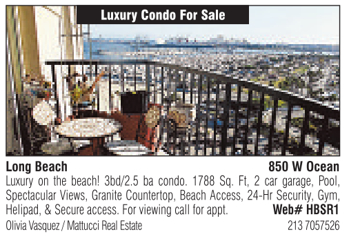 Long Beach Luxury Condo For Sale 850 WOcean Luxury on the beach! 3bd/2.5 ba condo. 1788 Sq. Ft, 2 car garage, Pool, Spectacular Views, Granite Countertop, Beach Access, 24-Hr Security, Gym, Helipad, &Secureaccess. For viewing call forappt. Web# HBSR1 Olivia Vasquez /Mattucci Real Estate 213 7057526