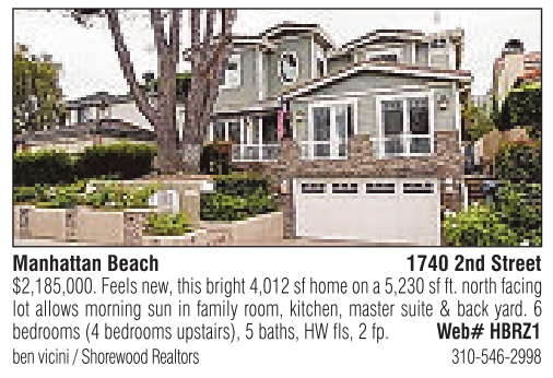 Manhattan Beach 1740 2nd Street $2,185,000. Feels new, this bright 4,012 sf home on a5,230 sf ft. north facing lot allows morning sun in family room, kitchen, master suite &back yard. 6bedrooms (4 bedrooms upstairs), 5baths, HWfls, 2fp. Web# HBRZ1 ben vicini /Shorewood Realtors 310-546-2998
