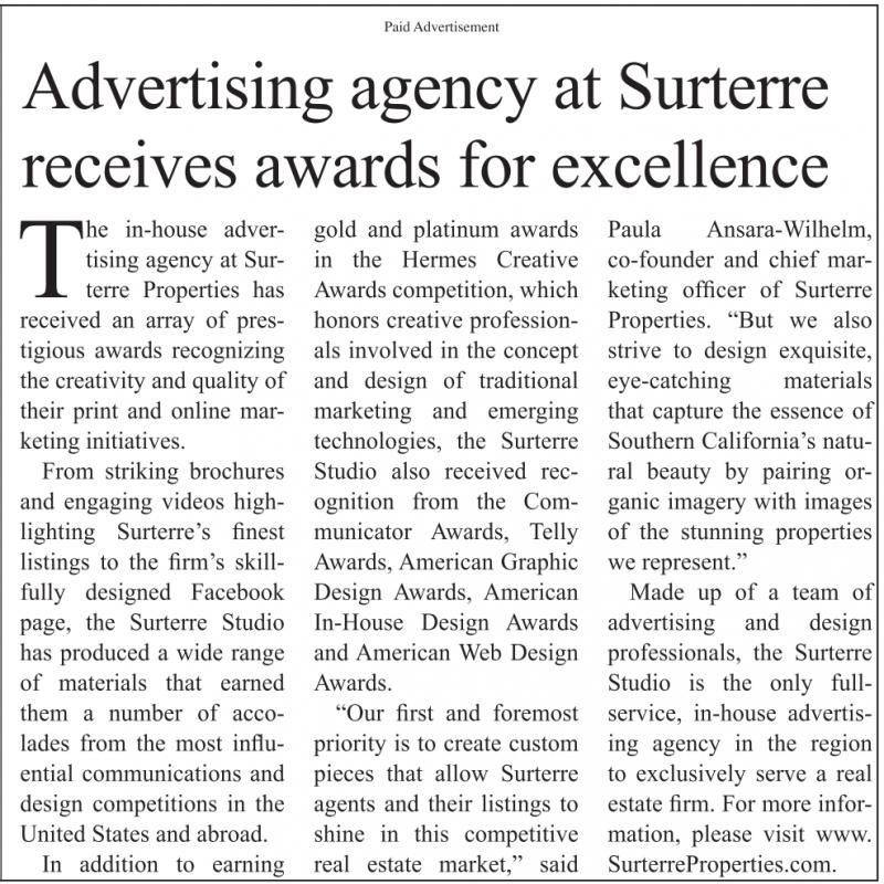 Made up of a team of advertising and design professionals, the Surterre Studio is the only fullservice, in-house advertising agency in the region to exclusively serve a real estate firm. For more information, please visit www.