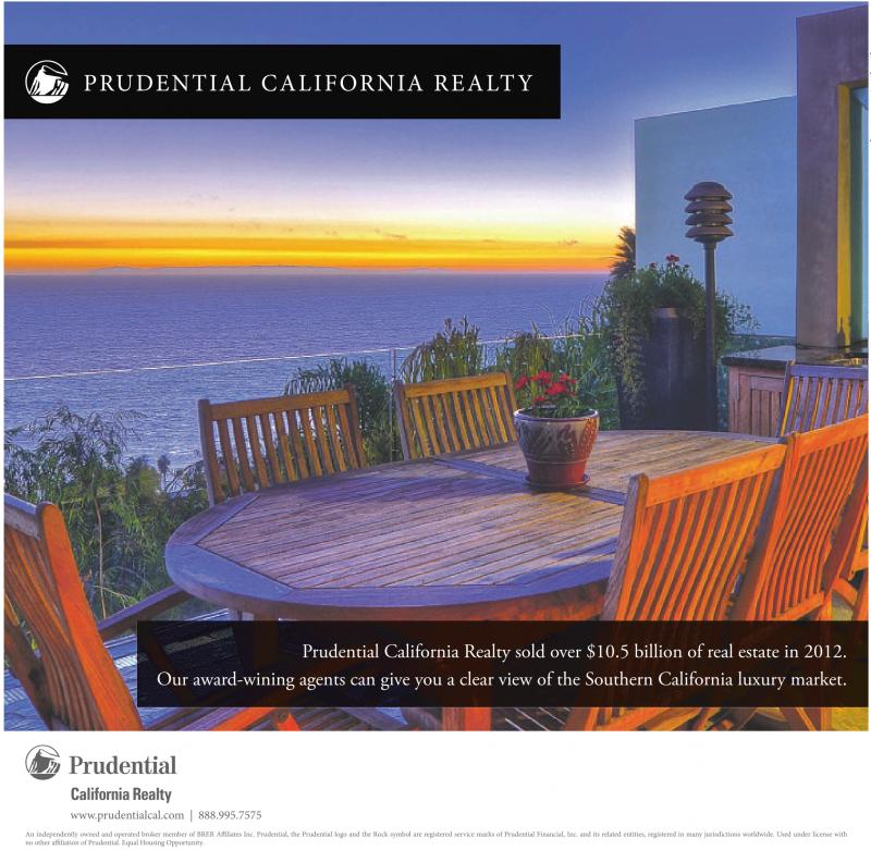 PRUDENTIAL CALIFORNIA REALT Y Prudential California Realty sold over $10.5 billion of real estate in 2012. Our award-wining agents can give you a clear view of the Southern California luxury market. www.prudentialcal.com | 888.995.7575 An independently owned and operated broker member ofBRER Affiliates Inc. Prudential, the Prudential logo and the Rock symbol are registered service marks of Prudential Financial, Inc. and its related entities, registered in many jurisdictions worldwide. Used under license with no other affiliation of Prudential.Equal HousingOpportunity. See also