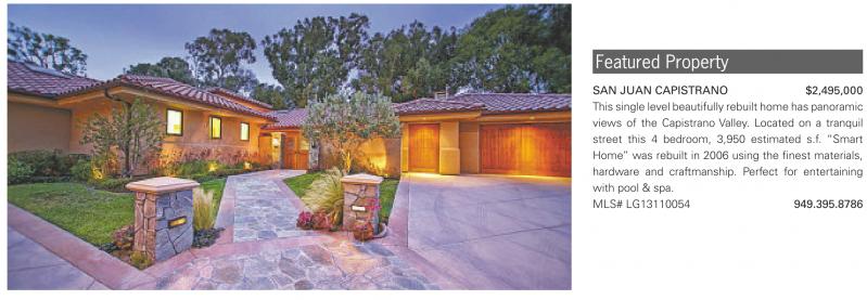 SAN JUAN CAPISTRANO $2,495,000 This single levelbeautifully rebuilt home has panoramic views of the Capistrano Valley. Located on a tranquil street this 4 bedroom, 3,950 estimated s.f. “Smart Home” was rebuilt in 2006 using the finest materials, hardware and craftmanship. Perfect for entertaining with pool & spa. MLS# LG13110054 949.395.8786