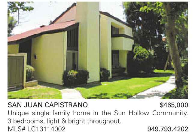 SAN JUAN CAPISTRANO $465,000 Unique single family home in the Sun Hollow Community. 3 bedrooms, light & bright throughout. MLS# LG13114002 949.793.4202
