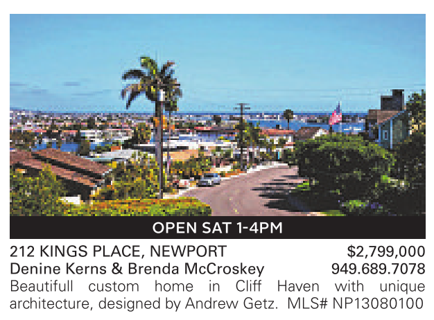 212 KINGS PLACE, NEWPORT $2,799,000 Denine Kerns & Brenda McCroskey 949.689.7078 Beautifull custom home in Cliff Haven with unique architecture, designed by Andrew Getz. MLS# NP13080100