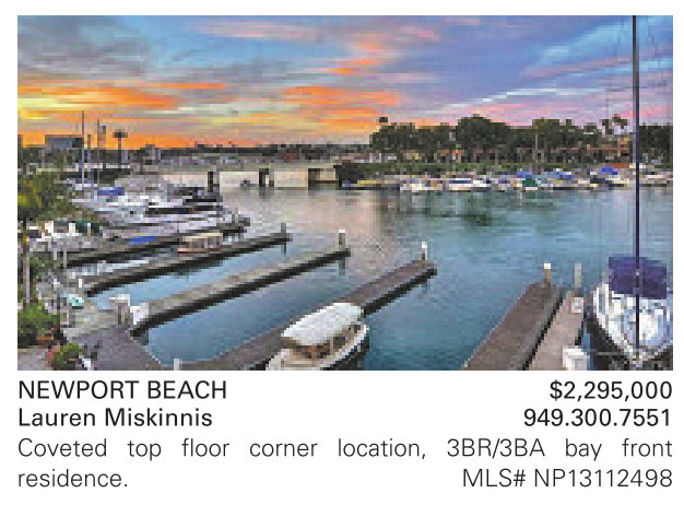 NEWPORT BEACH $2,295,000 Lauren Miskinnis 949.300.7551 Coveted top floor corner location, 3BR/3BA bay front residence. MLS# NP13112498