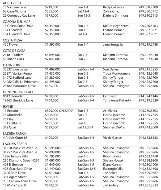 ALISO VIEJO 10 SolitaireLane $719,000 Sun 1-4 BettyCallaway 949.888.2300 63 Cape Victoria $555,000 Sat 12-4 ZohreGhazi 949.350.5712 25 Coronado Cay Lane $375,000 Sun 12-3 Darlene Simmons 949.910.5915 CORONA DEL MAR 15 Goleta Point Drive $6,349,000 Sun 2-5 McCroskey/ Kerns 949.280.5563 1843 Seadrift $2,350,000 Sun 1-5 Leanne Boman 949.887.9871 1843 SeadriftDrive $2,350,000 Sat 1-4 Leeann Boman 949.887.9871 COSTAMESA 420 Flower $1,395,000 Sun 1-4 Jane Sungaila 949.219.2488 COTO DE CAZA 23181 Pradera $4,695,000 Sat 2-5 Mariann Cordova 949.307.4040 5Canada Oaks $2,845,000 Sun 2-5 Mariann Cordova 949.307.4040 DANA POINT 33832 Blue Lantern $1,499,000 Sat/Sun 1-4 Suzi Dailey 949.315.5255 22871 ViaSan Remo $1,435,000 Sun 2-5 TroyaMontgomery 949.412.3048 34072 BedfordLane $1,389,000 Sun 2-5 Shirley Tenger 949.422.7700 34082 Calle La Primavera $1,295,000 Sat 2-5 Shirley Tenger 949.422.7700 25182 Manzanita Drive $865,000 Sat/Sun 1-5 Shauna Covington 949.395.8786 HUNTINGTON BEACH 9642 Flounder $788,800 Sat/Sun 1-5 Earl Taylor 714.394.1146 19562 Elmridge Lane $769,000 Sat/Sun 1-4 Tomi Anne Flaherty 949.219.2529 IRVINE 11 Recodo $899,900-$918,900* Sun 1-5 ArtRivera 949.230.8303 75 Monticello $908,000 Sat 1-5 Doris Lipscomb 714.585.7355 26 Clay $868,000 Sat 1-5 Doris Lipscomb 714.585.7355 154 Trellis Ln $765,000 Sun 1-5 Doris Lipscomb 714.585.7355 342 Quail $529,000 Sat 12:30-4 Stephen DeVre 949.443.2000 LADERA RANCH 4Arabis Court85 $409,000 Sat/Sun 1-4 Vickie Garrett 949.683.8533 LAGUNA BEACH 31510 MarVista Avenue $3,595,000 Sat/Sun 1-5 Shauna Covington 949.395.8786 31752 MarVista Avenue $2,899,000 Sat/Sun 1-5 Shauna Covington 949.395.8786 1936 Temple Hills $2,795,000 Sun 1-5 Bryonsavon 949.632.1458 230 Diamond Street #230 $1,695,000 Sat/Sun 1-5 Shalan Nowak 949.338.9800 403 El Bosque $1,649,000 Sat/Sun 1-5 Diane Cannon 949.230.1200 425 Graceland Drive $1,149,000 Sat/Sun 12-5 EustorgioVilla 949.632.1698 3100 Bern Drive $1,010,000 Sun 1-5 Joe Baker 949.499.0567 354 AgateStreet $998,000 Sat/Sun 1-5 Shauna Covington 949.395.8786 236 Canyon AcresDrive $960,000 Sat/Sun 1-5 Shauna Covington 949.395.8786 1570 ViaCapri 9 $599,500 Sat/Sun 2-6 Jim Ardery 949.887.3823