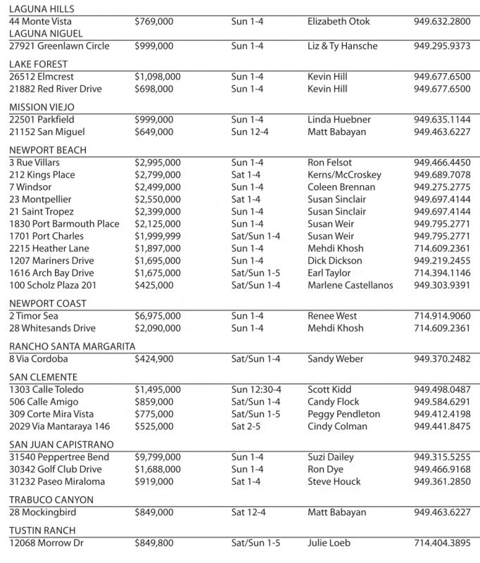 LAGUNA HILLS 44 MonteVista $769,000 Sun 1-4 Elizabeth Otok 949.632.2800 LAGUNA NIGUEL 27921 Greenlawn Circle $999,000 Sun 1-4 Liz &TyHansche 949.295.9373 LAKE FOREST 26512 Elmcrest $1,098,000 Sun 1-4 Kevin Hill 949.677.6500 21882 Red RiverDrive $698,000 Sun 1-4 Kevin Hill 949.677.6500 MISSION VIEJO 22501 Parkfield $999,000 Sun 1-4 Linda Huebner 949.635.1144 21152 San Miguel $649,000 Sun 12-4 Matt Babayan 949.463.6227 NEWPORTBEACH 3Rue Villars $2,995,000 Sun 1-4 Ron Felsot 949.466.4450 212 Kings Place $2,799,000 Sat 1-4 Kerns/McCroskey 949.689.7078 7Windsor $2,499,000 Sun 1-4 Coleen Brennan 949.275.2775 23 Montpellier $2,550,000 Sat 1-4 Susan Sinclair 949.697.4144 21 Saint Tropez $2,399,000 Sun 1-4 Susan Sinclair 949.697.4144 1830 Port Barmouth Place $2,125,000 Sun 1-4 Susan Weir 949.795.2771 1701 Port Charles $1,999,999 Sat/Sun 1-4 Susan Weir 949.795.2771 2215 Heather Lane $1,897,000 Sun 1-4 Mehdi Khosh 714.609.2361 1207 Mariners Drive $1,695,000 Sun 1-4 Dick Dickson 949.219.2455 1616 Arch BayDrive $1,675,000 Sat/Sun 1-5 Earl Taylor 714.394.1146 100 Scholz Plaza 201 $425,000 Sat/Sun 1-4 Marlene Castellanos 949.303.9391 NEWPORTCOAST 2Timor Sea $6,975,000 Sun 1-4 Renee West 714.914.9060 28 Whitesands Drive $2,090,000 Sun 1-4 Mehdi Khosh 714.609.2361 RANCHO SANTAMARGARITA 8Via Cordoba $424,900 Sat/Sun 1-4 Sandy Weber 949.370.2482 SAN CLEMENTE 1303 Calle Toledo $1,495,000 Sun 12:30-4 Scott Kidd 949.498.0487 506 Calle Amigo $859,000 Sat/Sun 1-4 Candy Flock 949.584.6291 309 CorteMira Vista $775,000 Sat/Sun 1-5 Peggy Pendleton 949.412.4198 2029 ViaMantaraya 146 $525,000 Sat 2-5 Cindy Colman 949.441.8475 SAN JUAN CAPISTRANO 31540 Peppertree Bend $9,799,000 Sun 1-4 Suzi Dailey 949.315.5255 30342 Golf Club Drive $1,688,000 Sun 1-4 Ron Dye 949.466.9168 31232Paseo Miraloma $919,000 Sat 1-4 SteveHouck 949.361.2850 TRABUCOCANYON 28 Mockingbird $849,000 Sat 12-4 Matt Babayan 949.463.6227 TUSTIN RANCH 12068 Morrow Dr $849,800 Sat/Sun 1-5 Julie Loeb 714.404.3895