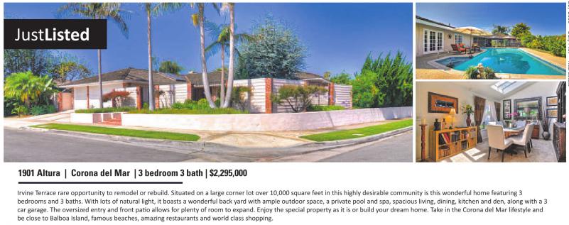 JustListed 1901 Altura | Corona del Mar | 3 bedroom 3 bath | $2,295,000 Irvine Terrace rare opportunity to remodel or rebuild. Situated on a large corner lot over 10,000 square feet in this highly desirable community is this wonderful home featuring 3 bedrooms and 3 baths. With lots of natural light, it boasts a wonderful back yard with ample outdoor space, a private pool and spa, spacious living, dining, kitchen and den, along with a 3 be close to Balboa Island, famous beaches, amazing restaurants and world class shopping. See also