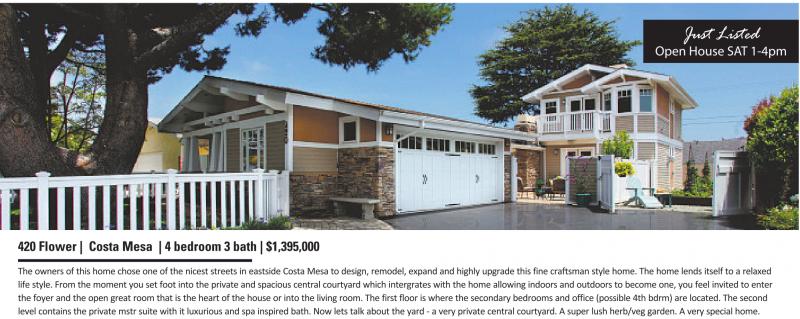 Just Listed Open House SAT 1-4pm 420 Flower | Costa Mesa | 4 bedroom 3 bath | $1,395,000 The ownersofthis home chose one of the nicest streets in eastside Costa Mesa to design, remodel, expand and highly upgrade this fine craftsman style home.The home lends itself to arelaxed life style. Fromthe moment you setfoot into the private and spacious centralcourtyard which intergrateswith the home allowingindoors and outdoorstobecomeone, you feelinvitedtoenter the foyerand the open greatroom that is the heartofthe house or into the living room.The firstfloor is where the secondary bedrooms and office (possible 4th bdrm)are located.The second level contains the private mstrsuite with it luxurious and spa inspiredbath. Now lets talk aboutthe yard -avery private central courtyard.Asuper lush herb/veggarden. Avery special home. See also