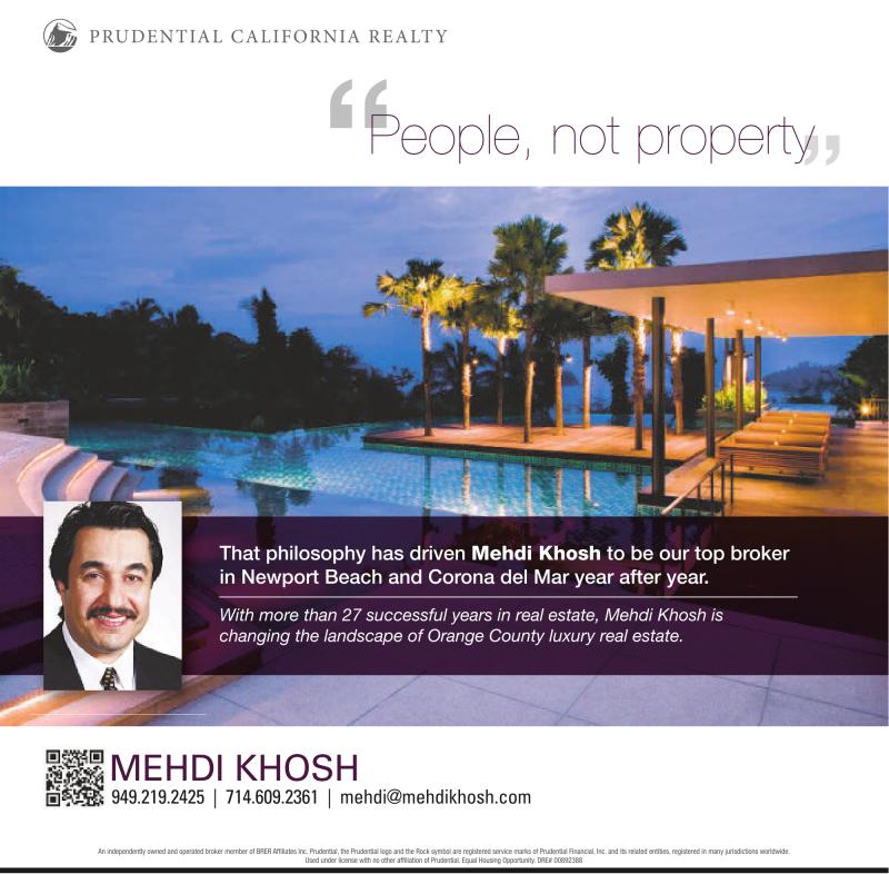 PRUDENTIAL CALIFORNIA REALT Y “ People, not property ” That philosophy has driven Mehdi Khosh to be our top broker in Newport Beach and Corona del Mar year after year. With more than 27 successful years in real estate, Mehdi Khosh is changing the landscape of Orange County luxury real estate. MEHDI KHOSH 949.219.2425 | 714.609.2361 | mehdi@mehdikhosh.com An independently owned and operated broker member of BRER Affiliates Inc. Prudential, the Prudential logo and the Rock symbol are registered service marks of Prudential Financial, Inc. and its related entities, registered in manyjurisdictions worldwide. Used under license with no other affiliation of Prudential. Equal Housing Opportunity.DRE# 00892388 See also