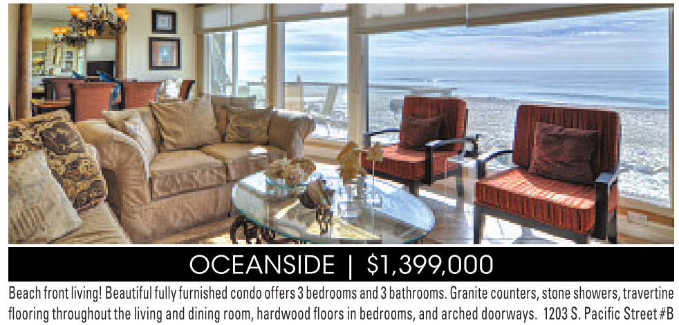 OCEANSIDE | $1,399,000 Beachfront living!Beautifulfullyfurnished condooffers3bedrooms and3bathrooms.Granite counters,stone showers, travertine flooringthroughoutthe living anddiningroom,hardwood floorsinbedrooms,and arched doorways. 1203S.PacificStreet#B