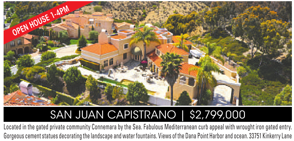 SAN JUAN CAPISTRANO | $2,799,000 Locatedinthe gatedprivate community Connemarabythe Sea. Fabulous Mediterraneancurbappeal with wroughtirongatedentry. Gorgeous cement statuesdecorating thelandscapeand waterfountains.Views of theDanaPointHarborand ocean. 33751Kinkerry Lane
