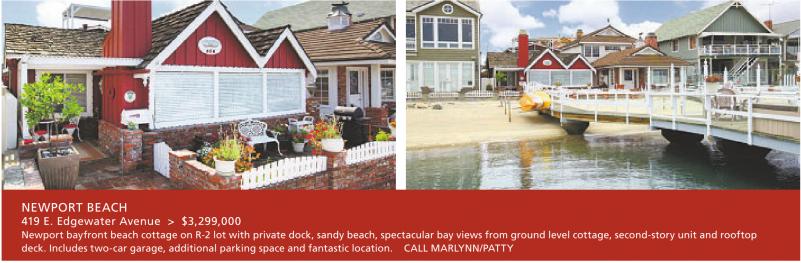 NEWPORT BEACH 419 E. Edgewater Avenue > $3,299,000 Newport bayfront beach cottage on R-2 lot with private dock, sandy beach, spectacular bay views from ground level cottage, second-story unit and rooftop deck. Includes two-car garage, additional parking space and fantastic location. CALL MARLYNN/PATTY