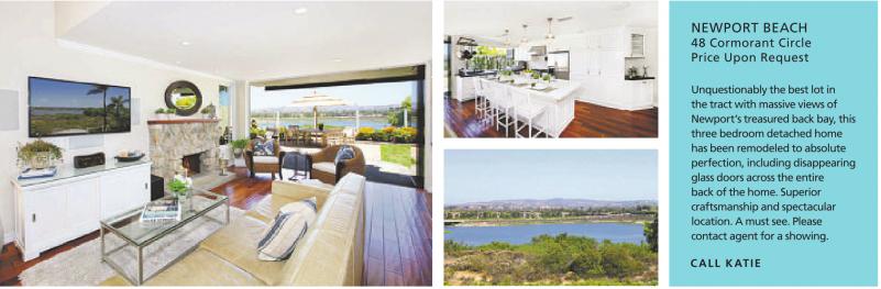 NEWPORT BEACH 48 Cormorant Circle Price Upon Request Unquestionably the bestlot in thetract withmassiveviews of Newport’streasuredbackbay,this threebedroom detached home hasbeenremodeledtoabsolute perfection, includingdisappearing glass doorsacrossthe entire back of thehome. Superior craftsmanship andspectacular location. Amustsee.Please contactagentfor ashowing. CALL KATIE