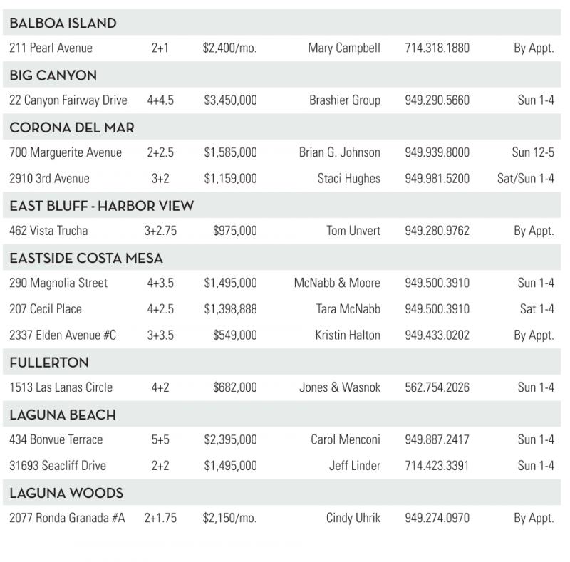 BALBOAIS ND 211 Pearl Avenue 2+1 $2,400/mo. Mary Campbell 714.318.1880 By Appt. BIG CANYON 22 Canyon Fairway Drive 4+4.5 $3,450,000 Brashier Group 949.290.5660 Sun 1-4 CORONA DEL MAR 700 Marguerite Avenue 2+2.5 $1,585,000 Brian G. Johnson 949.939.8000 Sun 12-5 2910 3rd Avenue 3+2 $1,159,000 Staci Hughes 949.981.5200 Sat/Sun 1-4 EASTBLUFF -HARBOR VIEW 462 Vista Trucha 3+2.75 $975,000 TomUnvert 949.280.9762 By Appt. EASTSIDE COSTA MESA 290 Magnolia Street 4+3.5 $1,495,000 McNabb &Moore 949.500.3910 Sun 1-4 207 Cecil Place 4+2.5 $1,398,888 Tara McNabb 949.500.3910 Sat 1-4 2337 Elden Avenue #C 3+3.5 $549,000 Kristin Halton 949.433.0202 By Appt. FULLERTON 1513 Las Lanas Circle 4+2 $682,000 Jones &Wasnok 562.754.2026 Sun 1-4 GUNA BEACH 434 Bonvue Terrace 5+5 $2,395,000 Carol Menconi 949.887.2417 Sun 1-4 31693 Seacliff Drive 2+2 $1,495,000 Jeff Linder 714.423.3391 Sun 1-4 GUNA WOODS 2077 Ronda Granada #A 2+1.75 $2,150/mo. Cindy Uhrik 949.274.0970 By Appt.