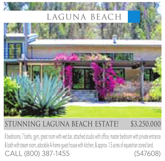 LAGUNA BEACH STUNNING LAGUNA BEACH ESTATE! $3,250,000 8bedrooms, 7baths, gym, great room with wet bar, attached studio with office, master bedroom with private entrance &bath with steam room, adorable A-frame guest house with kitchen, &approx. 1.5 acres of equestrian zoned land. CALL (800) 387-1455 (547608) See also
