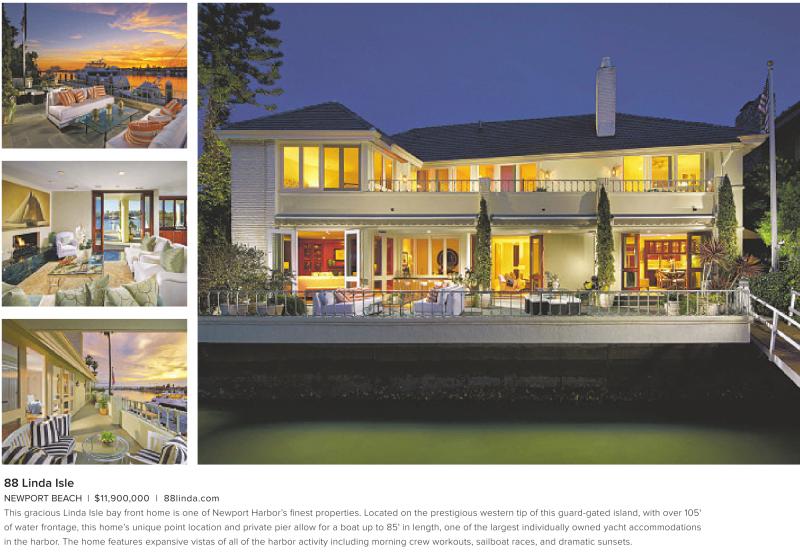 88 Linda Isle NEWPORT BEACH | $11,900,000 | 88linda.com This gracious Linda Isle bay front home is one of Newport Harbor’s finest properties. Located on the prestigious western tip of this guard-gated island, with over 105' of water frontage, this home’s unique point location and private pier allow for a boat up to 85' in length, one of the largest individually owned yacht accommodations in the harbor. The home features expansive vistas of all of the harbor activity including morning crew workouts, sailboat races, and dramatic sunsets.