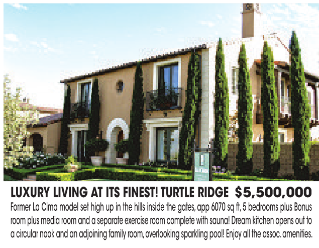 LUXURY LIVING AT ITS FINEST! TURTLE RIDGE $5,500,000 Former La Cima model set high up in the hills inside the gates,app 6070 sq ft, 5bedrooms plus Bonus room plus media room and aseparate exercise room complete with sauna! Dream kitchen opens out to acircular nook and an adjoining family room, overlooking sparkling pool! Enjoy all the assoc. amenities.