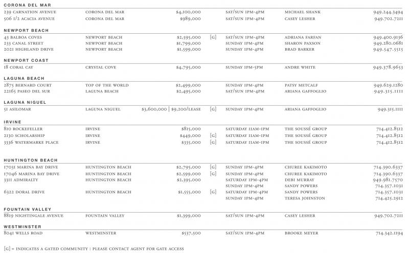 43 balboa coves newport beach $2,595,000 [g] sat/sun 1pm-4pm adriana farfan 949.400.9136 233 canal street newport beach $1,799,000 sunday 1pm-4pm sharon paxson 949.280.0681 2021 highland drive newport beach $1,599,000 sunday 1pm-4pm brad barker 949.547.5515