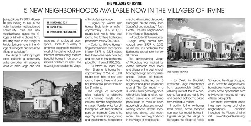 15, 2013) -homebuyers looking to live in the nation’s premier master-planned community, have five new neighborhoods across the villages of Irvine® to choose from, including three in the village of Portola springs®, one in the village of stonegate and one in the village of Woodbury™.