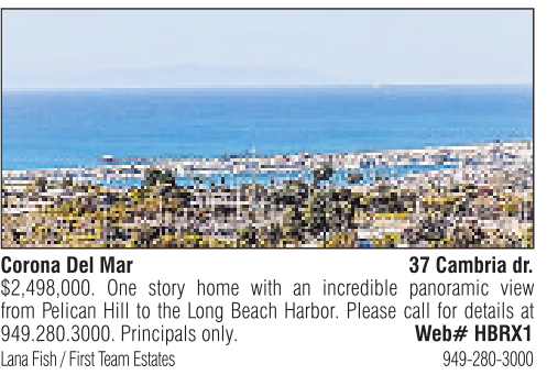 Corona Del Mar 37 Cambria dr. $2,498,000. One story home with an incredible panoramic view from Pelican Hill to the Long Beach Harbor. Please call for details at 949.280.3000. Principals only. Web# HBRX1 Lana Fish /First Team Estates 949-280-3000
