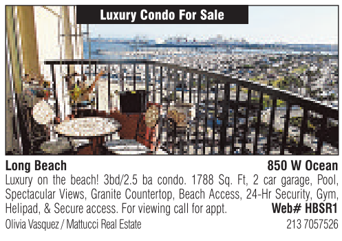 Luxury Condo For Sale Long Beach 850 WOcean Luxury on the beach! 3bd/2.5 ba condo. 1788 Sq. Ft, 2 car garage, Pool, Spectacular Views, Granite Countertop, Beach Access, 24-Hr Security, Gym, Helipad, &Secureaccess. For viewing call for appt. Web# HBSR1 Olivia Vasquez /Mattucci Real Estate 213 7057526