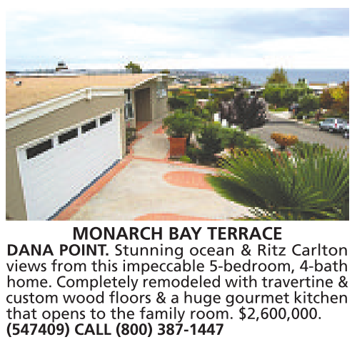 MONARCH BAY TERRACE DANA POINT. Stunning ocean & Ritz Carlton views from this impeccable 5-bedroom, 4-bath home. Completely remodeled with travertine & custom wood floors & a huge gourmet kitchen that opens to the family room. $2,600,000. (547409) CALL (800) 387-1447