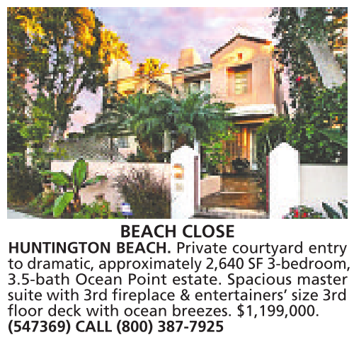 BEACH CLOSE HUNTINGTON BEACH. Private courtyard entry to dramatic, approximately 2,640 SF 3-bedroom, 3.5-bath Ocean Point estate. Spacious master suite with 3rd fireplace &entertainers’ size 3rd floor deck with ocean breezes. $1,199,000. (547369) CALL (800) 387-7925
