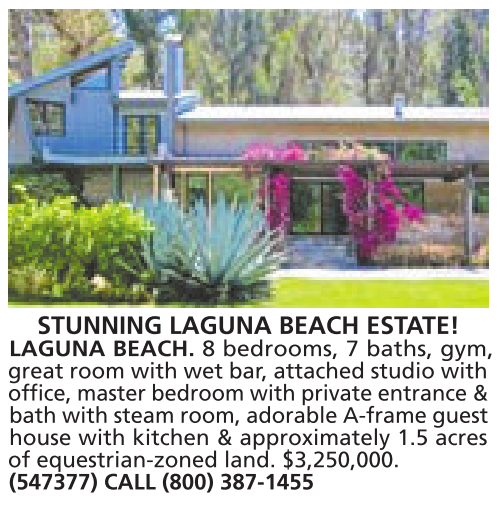 STUNNING LAGUNA BEACH ESTATE! LAGUNA BEACH. 8 bedrooms, 7 baths, gym, great room with wet bar, attached studio with office, master bedroom with private entrance & bath with steamroom, adorable A-frame guest house with kitchen & approximately 1.5 acres of equestrian-zoned land. $3,250,000. (547377) CALL (800) 387-1455