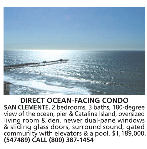 DIRECT OCEAN-FACING CONDO SAN CLEMENTE. 2bedrooms, 3baths, 180-degree view of the ocean, pier &Catalina Island, oversized living room & den, newer dual-pane windows & sliding glass doors, surround sound, gated community with elevators &apool. $1,189,000. (547489) CALL (800) 387-1454
