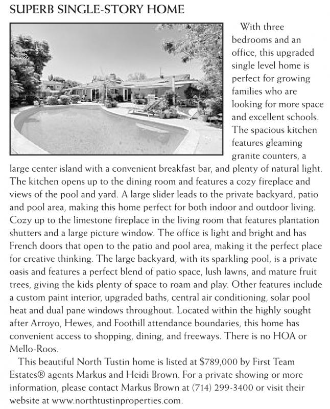 This beautiful North Tustin home is listed at $789,000 by First Team Estates® agents Markus and Heidi Brown. For a private showing or more information, please contact Markus Brown at (714) 299-3400 or visit their website at www.northtustinproperties.com.