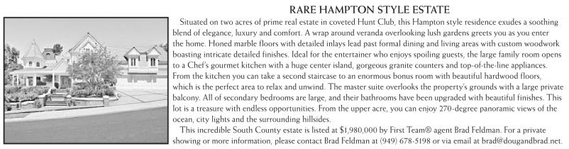 This incredible South County estate is listed at $1,980,000 by First Team® agent Brad Feldman. For a private showing or more information, please contact Brad Feldman at (949) 678-5198 or via email at brad@dougandbrad.net.