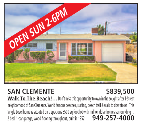 SAN CLEMENTE $839,500 Walk To TheBeach!… Don’tmissthis opportunitytoown in thesought after T-Street neighborhood of SanClemente.World famous beaches, surfing,beachtrail&walk to downtown!This Single Levelhome is situated on aspacious 5500 sq foot lotwithmillion dolarhomessurrounding it. 2bed, 1-cargarage, wood flooringthroughout,built in 1952. 949-257-4000