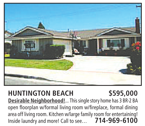 HUNTINGTON BEACH $595,000 Desirable Neighborhood!... This single storyhome has3BR-2BA open floorplan w/formal living room w/fireplace, formal dining area offliving room. Kitchen w/large family room for entertaining! Inside laundryand more!Calltosee… 714-969-6100