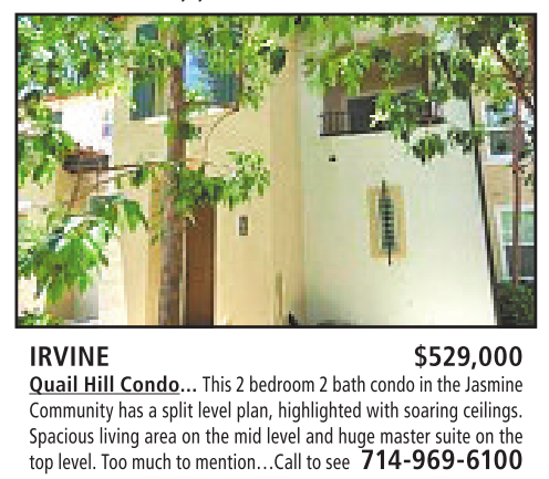 outdoorshower, security systemand muchmore. IRVINE $529,000 Quail Hill Condo... This 2bedroom2bathcondointhe Jasmine Community has asplit level plan, highlighted with soaring ceilings. Spacious living area on the mid level and huge master suite onthe toplevel.Too muchtomention…Calltosee 714-969-6100