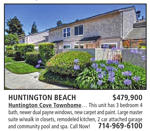 Inside laundryand more!Calltosee… HUNTINGTON BEACH $479,900 Huntington Cove Townhome… This unit has 3bedroom 4 bath, newer dual paynewindows,new carpet andpaint. Large master suite w/walkinclosets,remodeledkitchen,2car attachedgarage andcommunity pooland spa. Call Now! 714-969-6100