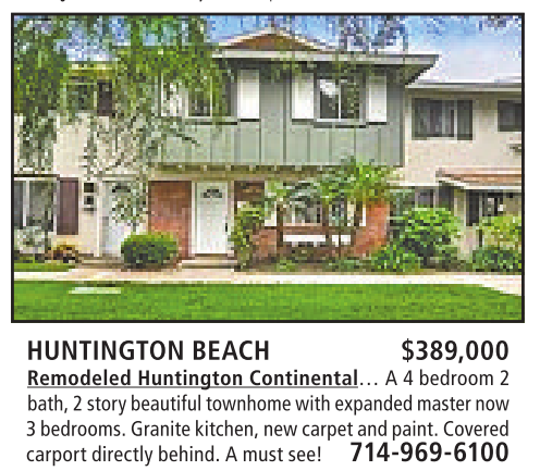 winningschools,LakeMission Viejo membershipincluded! HUNTINGTON BEACH $389,000 Remodeled Huntington Continental… A4bedroom 2 bath, 2story beautifultownhome with expanded masternow 3bedrooms. Granite kitchen,new carpet andpaint. Covered carportdirectlybehind. Amustsee! 714-969-6100