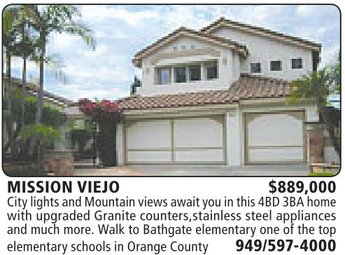 MISSION VIEJO $889,000 City lights andMountain viewsawaityou in this 4BD3BA home with upgraded Granite counters,stainless steel appliances and much more. Walk to Bathgate elementary one of the top elementary schools in Orange County 949/597-4000