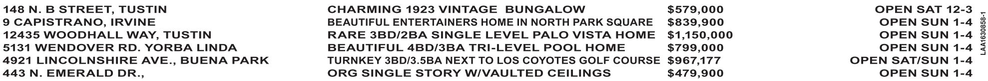 148 N. B STREET, TUSTIN CHARMING 1923 VINTAGE BUNGALOW $579,000 OPEN SAT 12-3 9 CAPISTRANO, IRVINE BEAUTIFUL ENTERTAINERS HOME IN NORTH PARK SQUARE $839,900 OPEN SUN 1-4 12435 WOODHALL WAY, TUSTIN RARE 3BD/2BA SINGLE LEVEL PALO VISTA HOME $1,150,000 OPEN SUN 1-4 5131 WENDOVER RD. YORBA LINDA BEAUTIFUL 4BD/3BA TRI-LEVEL POOL HOME $799,000 OPEN SUN 1-4 4921 LINCOLNSHIRE AVE., BUENA PARK TURNKEY 3BD/3.5BA NEXT TO LOS COYOTES GOLF COURSE $967,177 OPEN SAT/SUN 1-4 443 N. EMERALD DR., ORG SINGLE STORY W/VAULTED CEILINGS $479,900 OPEN SUN 1-4