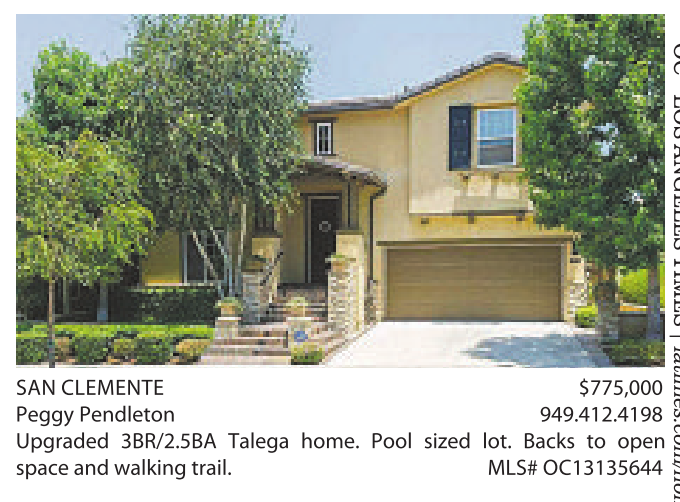 SAN CLEMENTE $775,000 Peggy Pendleton 949.412.4198 Upgraded 3BR/2.5BA Talega home. Pool sized lot. Backs to open space and walking trail. MLS# OC13135644