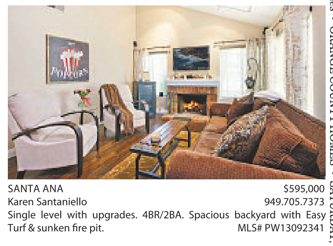 SANTA ANA $595,000 Karen Santaniello 949.705.7373 Single level with upgrades. 4BR/2BA. Spacious backyard with Easy Turf &sunken fire pit. MLS# PW13092341