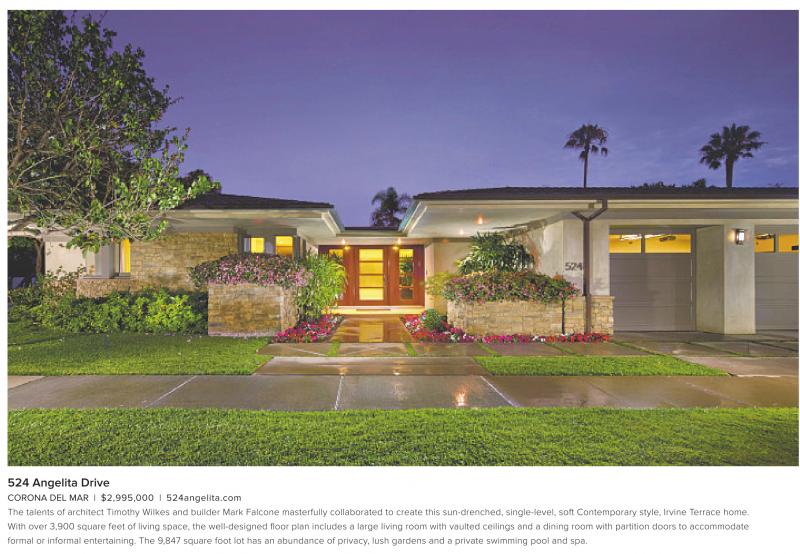 CORONA DEL MAR | $2,995,000 | 524angelita.com The talents of architect Timothy Wilkes and builder Mark Falcone masterfully collaborated to create this sun-drenched, single-level, soft Contemporary style, Irvine Terrace home. With over 3,900 square feet of living space, the well-designed floor plan includes a large living room with vaulted ceilings and a dining room with partition doors to accommodate formal or informal entertaining. The 9,847 square foot lot has an abundance of privacy, lush gardens and a private swimming pool and spa.