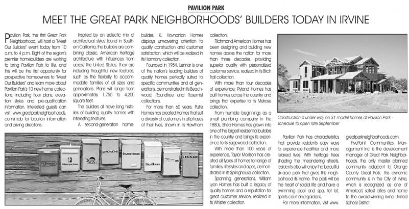 Park, the first Great Park Neighborhood, will host a “Meet our Builders” event today from 10 a.m. to 4 p.m. Eight of the region’s premier homebuilders are working to bring Pavilion Park to life, and this will be the first opportunity for prospective homeowners to “Meet our Builders” and learn more about Pavilion Park’s 10 new home collections, including floor plans, elevation styles and pre-qualification information. Interested guests can visit www.greatparkneighborhoods. com/mob for location information and driving directions.